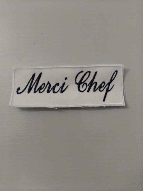 Patch Merci Chef brodé à coudre -fait en france-customisé-vêtement de cuisine-customisé-création en couture-écusson Merci Chef-mercerie-idée cadeau -brodé en france
